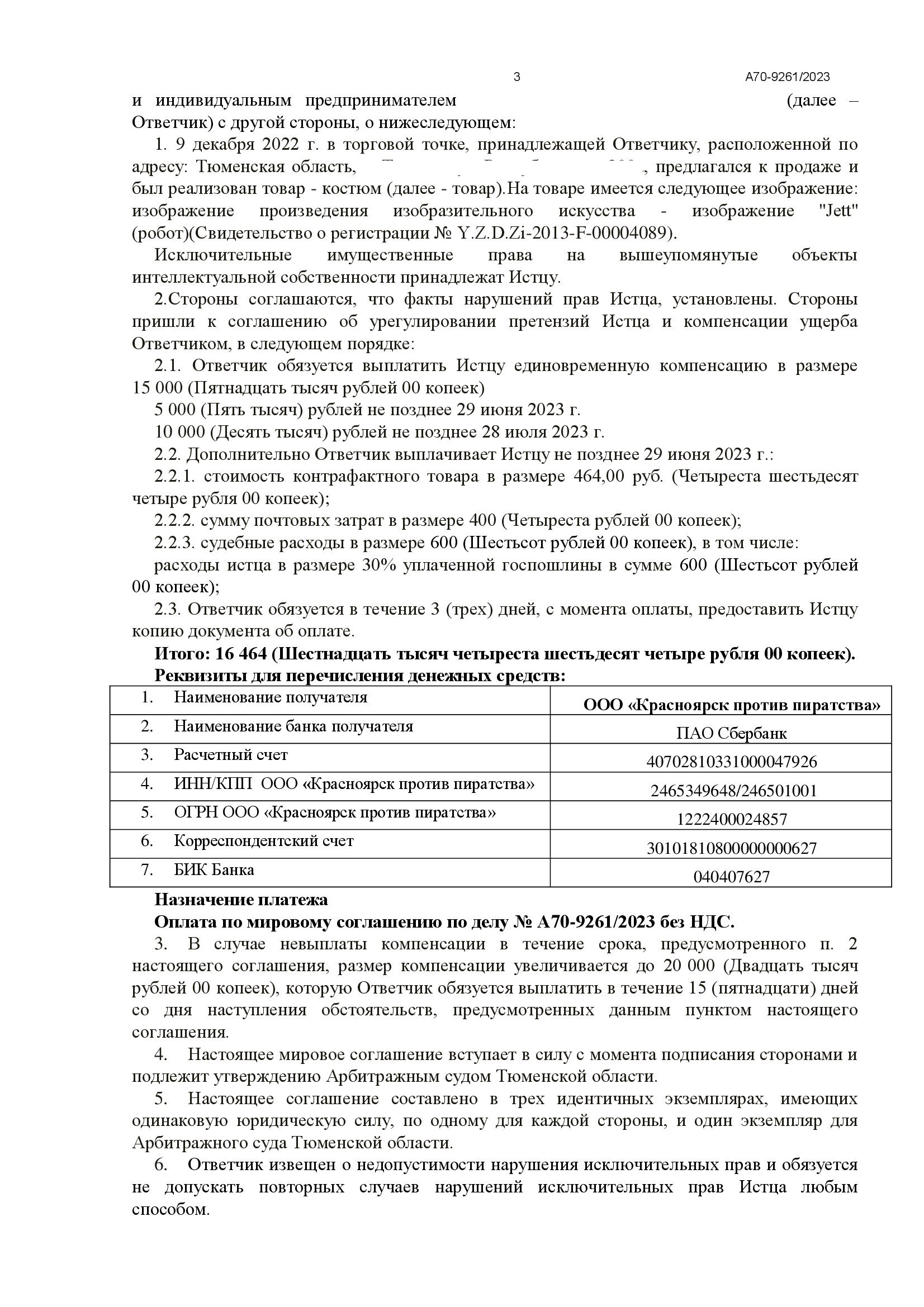 Alpha Group Co., Ltd обратилась в Арбитражный суд г. Тюмени с иском к Индивидуальному предпринимателю с требованием о взыскании компенсации за нарушение исключительных прав на изображение произведения изобразительного искусства - изображение «Jett» в сумме 20 000 руб. Была произведена контрольная закупка костюма с изображением персонажа мультфильма.